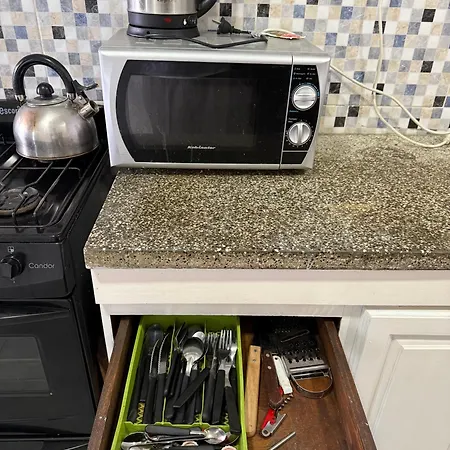 Gästerna är välkomna att laga sina egna måltider i ett komplett kök på boendet.